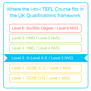 The i-to-i TEFL courses lead to a Level 3 qualification. This is the equivalent in difficulty to an A Level in the UK, a Collegeboard Advanced Placement exam (AP) in the USA, a Senior Secondary Certificate of Education (SSCE) in Australia or a Matric Exam in South Africa.